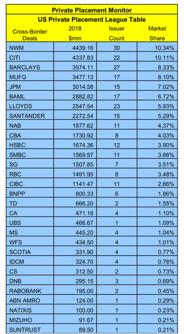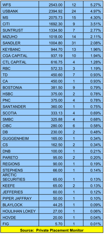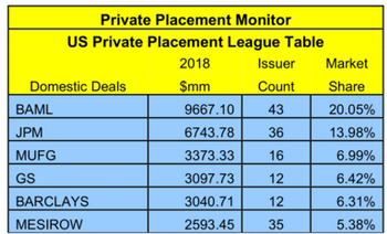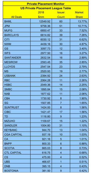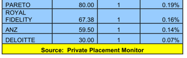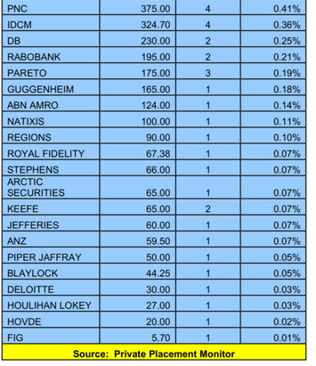Full credit is given to the lead agent; equal credit to co-lead agents; no credit to co-agents. Deal circle date used. All agents do not provide details and their share could rely on Private Placement Monitor market intelligence. Direct deals are not included in this League Table, but are included in other PPM studies.